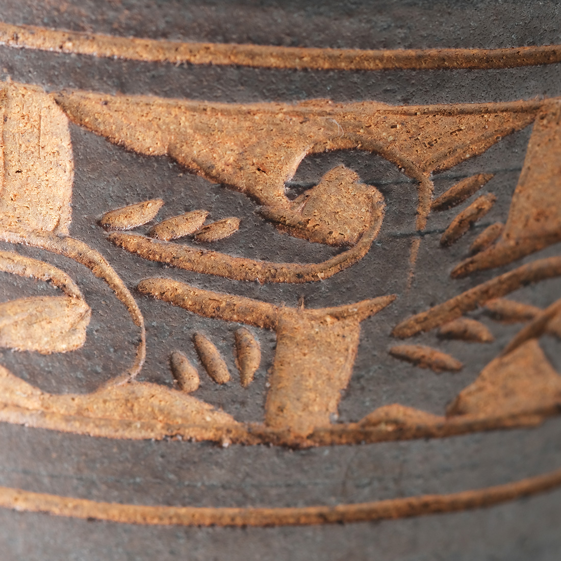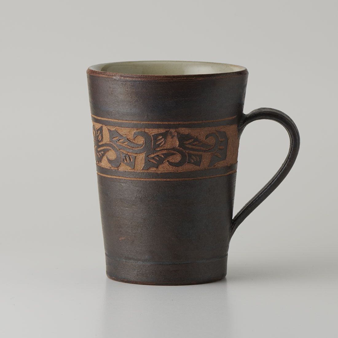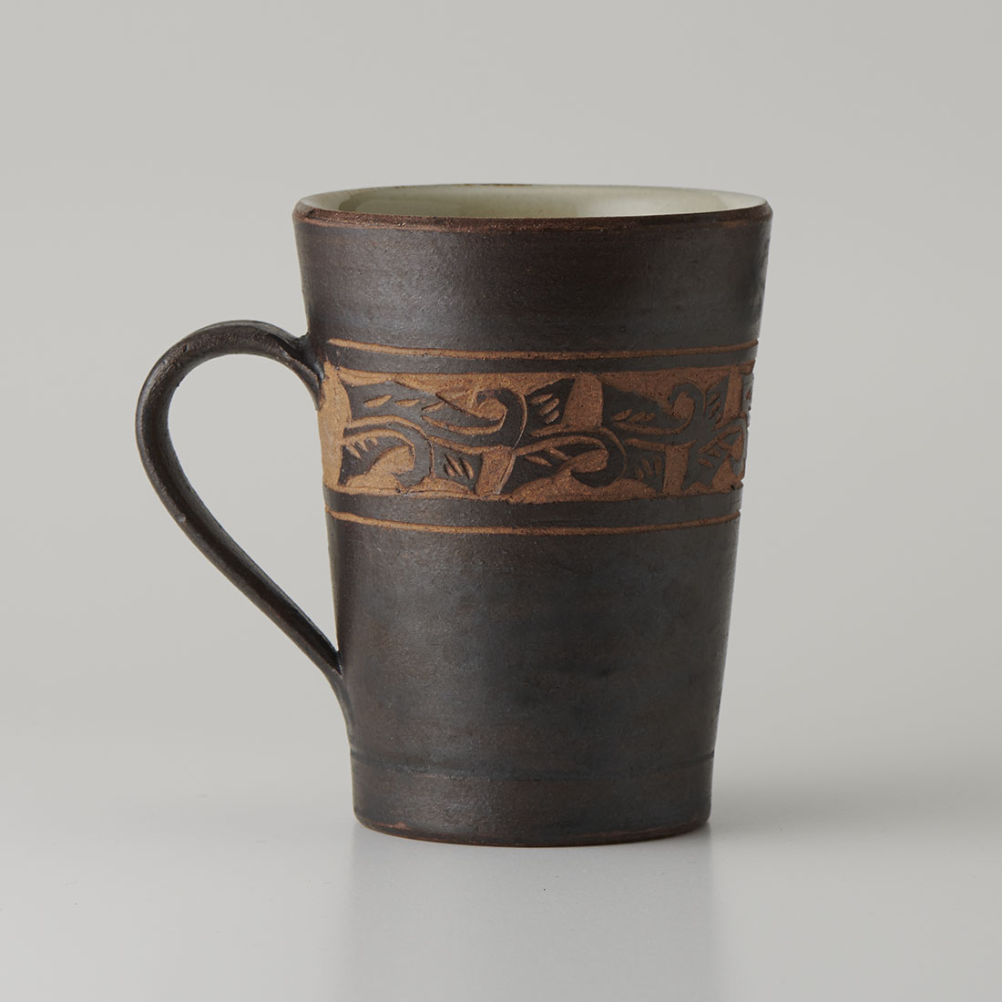 スッとしたシンプルなボディに柔らかなカーブを描く持ち手。荒削りで表情豊かな線彫りの唐草模様。沖縄らしいマグ